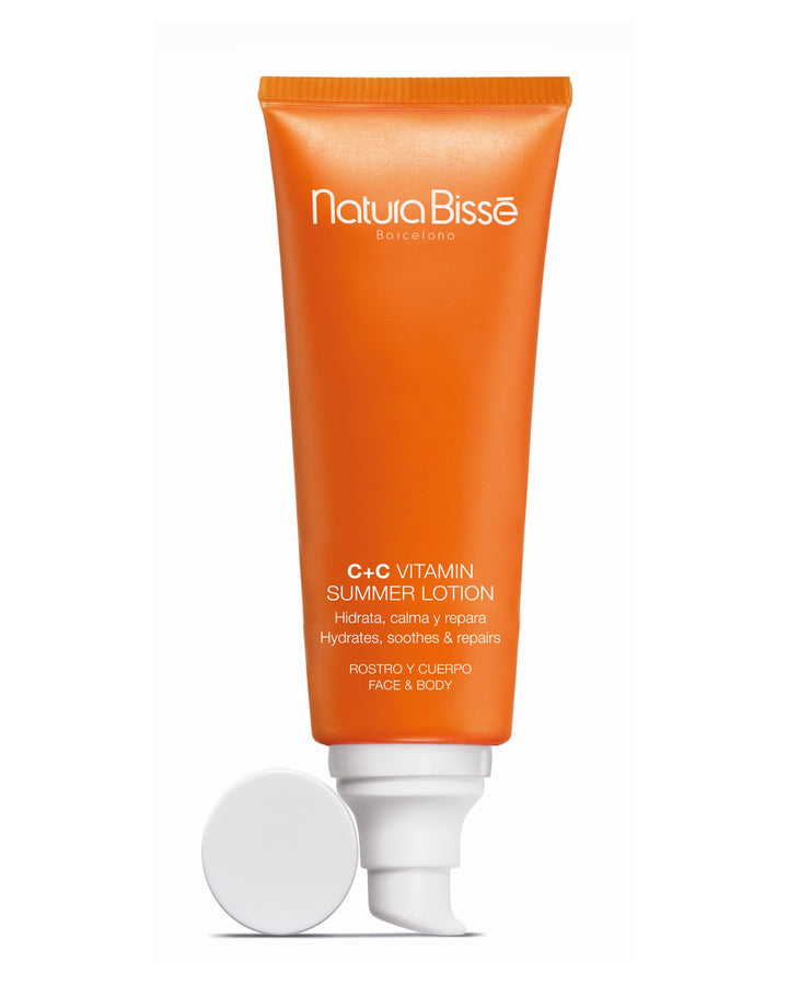 Natura Bissé C+C Vitamin Summer Lotion restaura inmediatamente la piel y elimina las sensaciones incómodas. La vitamina E y C previenen y reparan los daños solares, el Aloe Vera y la Manzanilla calman inmediatamente la piel, el extracto de naranja amarga tiene un ligero efecto exfoliante que mejora la estructura y firmeza de la piel y reduce la hiperpigmentación. El complejo pro-melanina garantiza un bronceado uniforme y duradero. C+C Vitamin Summer Lotion forma el dúo perfecto con el aceite seco antioxidante de vitamina C+C SPF30.